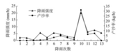 图 5 径流小区降雨强度与产沙率变化特征 Fig. 5 Variation characteristics of rainfall intensity and sediment yield in runoff plot |