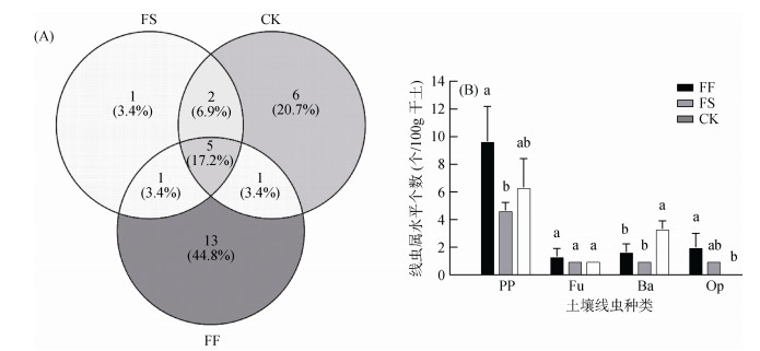 (FF为番茄连作,FS为水稻-番茄轮作,CK为休耕;Ba为食细菌线虫,Fu为食真菌线虫,PP为植物寄生线虫,Op为捕食/杂食线虫,下同。图柱上方小写字母不同表示不同种植制度间差异显著(Duncan新复极差法检验,P < 0.05) 图 1 不同种植制度土壤中线虫在属水平上的图解(A)及各营养类群属的数量变化(B) Fig. 1 Venn diagrams of soil nematodes at genus level (A) and changes in number of genera in various trophic groups (B) |
