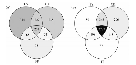Alpha多样性结果表明(表 3),FS处理中Sobs、Ace、Chao和Shannon均显著高于FF。FS土壤中真菌OTUs种类最多,为889个,是FF(444个)的两倍(图 2A);FS和CK共享OTUs数量最多,为总量的38.4%,FF分别与FS和CK共享占总OTUs数量均小于26.0%。不同种植制度下土壤中检出细菌OTUs种类约2 500 ~ 3 000个(图 2B);FS和CK共享占总OTUs数量最多,FF和FS共享占比最少。