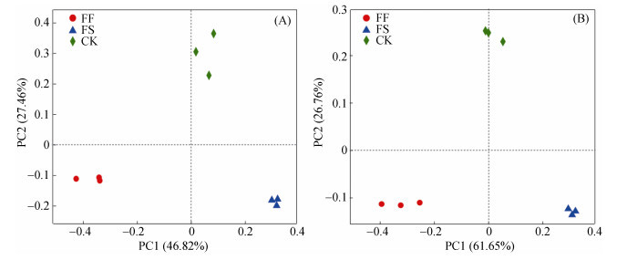 PCoA分析结果显示(图 3),FF、FS和CK土壤真菌和细菌群落组成分别位于不同象限,每个处理两两之间距离较远,各处理间的物种组成存在较大差异。每处理3个重复样本相似性距离接近,具有良好的可重复性。