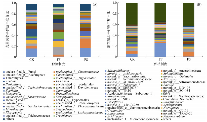(Unclassified在数据库中没对应的分类信息,Norank在某个分类学水平上没明确的分类信息,下同) 图 4 不同土壤的真菌(A)和细菌(B)在属水平的相对丰度 Fig. 4 Relative abundances of soil fungi (A) and bacteria (B) at genus levels under different planting patterns |