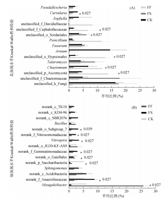 各处理真菌群落属水平组成相似,但相对丰度存在一定差异。在不同土样中主要优势类群有Arnium(阿尼菌属)、Chaetomium(毛壳菌属)、Talaromyces(篮状菌属),以及Ascomycota(子囊菌门)、Sordariales(粪壳菌目)和Chaetomiaceae(毛壳菌科)下未分类类群(图 4)。相对丰度前15个真菌类群Kruskal-Wallis秩和检验结果显示(图 5A),FS土壤中、Sordariales和Curvularia(弯孢属)均明显高于FF(图 5A中带*)和CK处理组。FS土壤中Ascomycota(子囊菌门)、Chaetomium(毛壳属)、Hypocreales(肉坐菌目)、Cephalothecaceae(黄丝菌科)的平均丰度均显著低于FF和CK处理组。FF与FS在属水平上真菌相对丰度差异明显。