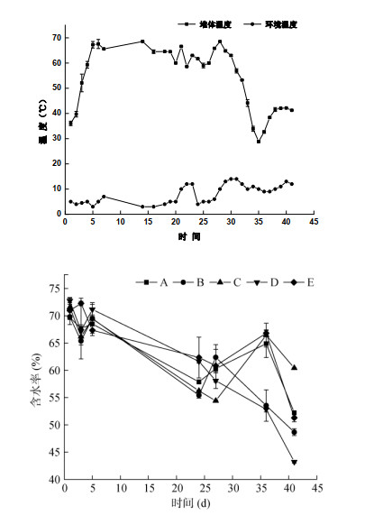 2 结果与分析 2.1 气流膜堆肥过程中堆体理化性质的变化 2.1.1 温度和含水量温度是反映堆肥腐熟发酵的一个重要指标,从图 1中可以看出,堆肥温度均经历了3个阶段(升温、高温和降温)。在堆肥开始后,温度便开始迅速上升,3 d时达到52.1 ℃,5 d时达到67 ℃,并且堆体温度在60 ℃以上持续了20 d以上。