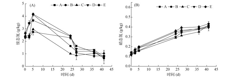A、B、C、D、E五个位置的铵态氮呈现先升高后降低的趋势,在5 d时都达到最高值,分别为2.74、4.14、2.96、3.67、4.17 g/kg,位置B和E的铵态氮含量较高,并且各处理间差异最大; 与堆肥开始时相比,堆肥结束时各位置的铵态氮含量分别下降了71.36%、72.11%、57.05%、68.13%和68.25%(图 4)。各位置的硝态氮含量均呈现逐渐升高趋势,在整个堆肥过程中,位置E的硝态氮含量略微高于其他位置,但差异不明显; 至堆肥结束时,各位置的硝态氮含量分别为0.41、0.40、0.42、0.40、0.43g/kg(图 4)。