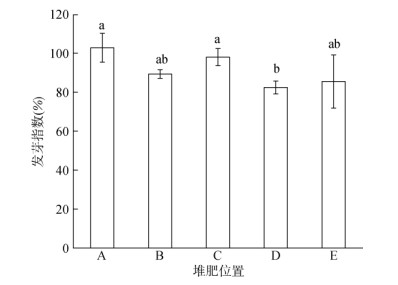(柱图上方不同小写字母表示不同位置堆肥间差异在P < 0.05水平显著) 图 5 堆肥结束后不同位置取样点发芽指数 Fig. 5 Sample germination indexes at different locations after composting |