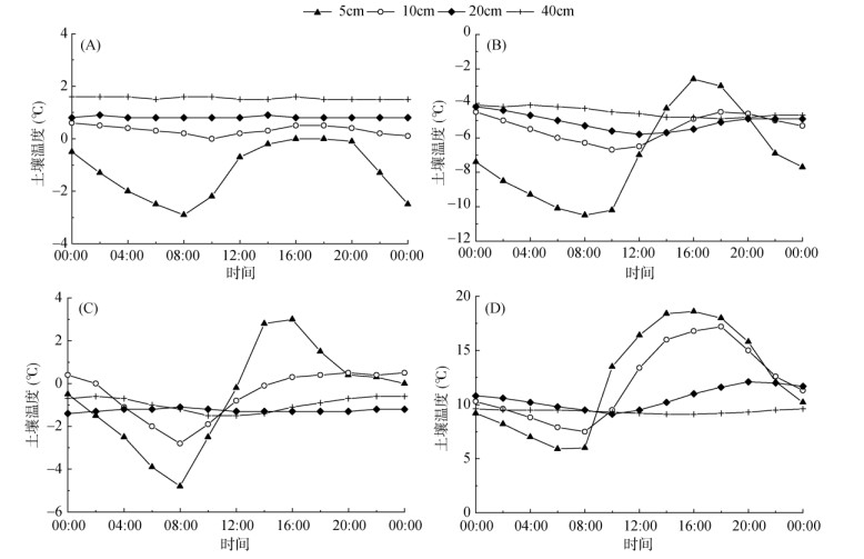 (A. 始冻期;B. 完全冻结期;C. 解冻期;D. 完全融化期) 图 3 不同冻融阶段典型日土壤温度日变化 Fig. 3 Diurnal variations of soil temperatures at different freezing-thawing stages |