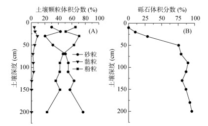 图 5 不同深度土壤颗粒组成(A)和砾石含量(B) Fig. 5 Soil particle composition (A)and gravel content(B)at different soil depths |