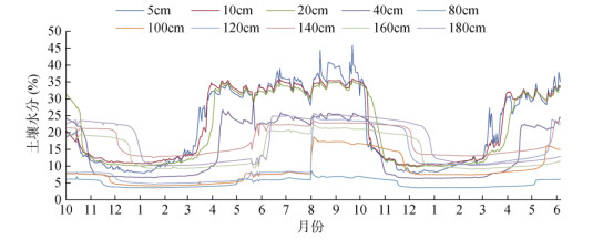 由日累计降水量和土壤未冻水剖面图(图 4)可见,土壤剖面水分格局与变化随冻融过程呈现周期性的波动,不同冻融阶段土壤水分的变化和分布具有显著的差异性。2018年10月至2019年3月中旬,土壤处于冻结阶段(始冻期+完全冻结期),各层土壤未冻结水分表现为较低值。浅层土壤(0 ~ 40 cm)和深层土壤(120 ~ 180 cm)水分明显高于中部(40 ~ 120 cm)。这可能是浅层土壤质地以粉粒为主,砾石含量少(图 5),土壤颗粒表面能大,持水能力强,因此土壤水分较高;土壤中部砂粒含量急剧增加,砾石含量达50% 以上,土壤颗粒表面能变小,持水能力变差,导水能力增强,同时在重力作用下,土壤下渗增强,使得土壤中层,尤其是80 cm土壤水分在整个冻融循环过程中,一直处在水分的低值区;剖面底部土壤质地以砂粒为主,砾石含量可达80% 以上,大量的砾石起到一定的隔水作用,同时在水势梯度驱动下,水分不断向冻结锋底部聚集,土壤水分较高。3月下旬至10月为冻土的融化阶段(解冻期+完全融化期),降水量增多,各层土壤水分增加,浅层土壤对降水响应明显,在土壤0 ~ 40 cm形成了一个水分的高值区,而深层土壤对降水的响应较弱。此外,深层土壤水分增加或减少的时间明显滞后于浅层土壤(图 4、图 6),例如,表层土壤水分3月开始增加,10月下旬减少,深层土壤水分5月下旬开始增加,12月中下旬减少。上述分析表明土壤剖面结构特征对土壤水分分布具有较强的解释性。