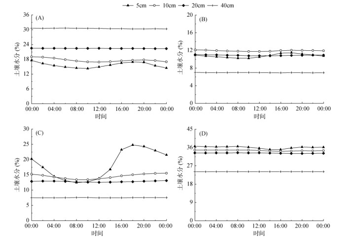 由不同冻融阶段土壤温度日变化曲线可见(图 3),土壤温度存在周期性的日变化特征。5 cm土层最低温出现在北京时间8:00左右,之后土壤温度快速上升,在午后达到最高,这种变化随着土层深度的不断增加,具有一定的滞后性。此外,始冻期5 cm土层最高温在14:00出现,一直持续到20:00后下降,完全融化期5 cm土壤也出现此现象,这可能是受中午太阳辐射增强的影响,土壤表层吸收了较多的热量,在植被和枯枝落叶层的保温作用下,土壤热量不易快速散失,土壤最高温度持续时间较长;而完全冻结期和解冻期5 cm土层最高温度在16:00左右出现后立即下降,持续时间较短。