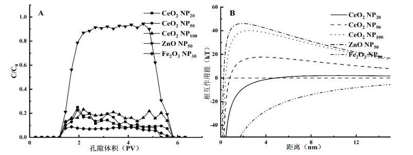 图 2 不同纳米颗粒的穿透曲线(A)和DLVO相互作用能曲线(B) Fig. 2 Penetration profiles (A) and DLVO interaction energy profiles (B) of different nanoparticles |