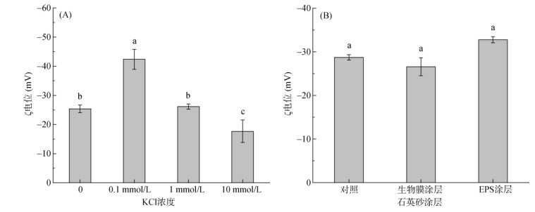 (图中小写字母不同表示处理间差异显著(P<0.05)) 图 5 不同离子强度下ZnO NPs(A)和不同表面涂层的石英砂(B)的ζ电位 Fig. 5 ζ potentials of ZnO NPs with different ionic strengths (A) and quartz sand with different surface coatings (B) |