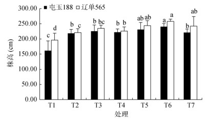 废水灌溉农田后,不同施肥处理对玉米生长发育影响显著(图 1)。两种供试玉米品种屯玉188和辽单565均表现出T6处理株高最高,T1处理株高最矮,两个品种各处理株高由高到低均为:T6 > T5 > T7 > T3 > T4 > T2 > T1,T1与其余各施肥处理之间差异显著。表明废水灌溉后仍然需要一定的肥料配施,且减化肥、增施生物有机肥和增氧剂对废水灌溉后的玉米生长影响效果最佳。