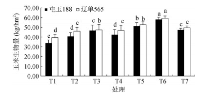 废水灌溉农田后,不同施肥处理对玉米地上生物量影响显著(图 2),两种供试玉米品种屯玉188和辽单565,不同施肥处理之间差异显著,其中T6处理生物量最高,T1处理最低,生物量由高到低顺序为T6 > T5 > T7 > T3 > T4 > T2 > T1,相对于T1,各施肥处理分别增加71.49、50.34%,51.32、33.57%,39.71%、25.58%,37.94%、19.95%,25.27%、18.60% 和20.08%、16.23%。表明废水灌溉后仍然需要一定的肥料配施,且减化肥、增施生物有机肥和增氧剂处理玉米生物量最高。