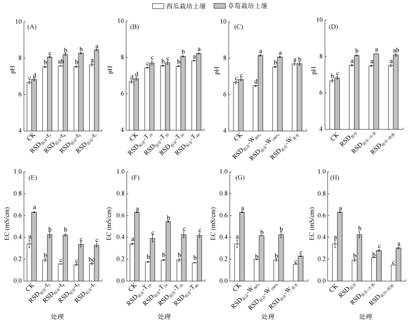 2 结果 2.1 土壤pH和电导率与CK相比,RSD处理均能有效提高西瓜和草莓栽培土壤的pH(图 1A~D),且草莓栽培土壤pH经RSD处理后上升幅度(12% ~ 24%)整体高于西瓜栽培土壤(12% ~ 17%)。在不同时间和温度影响下,RSD处理后,两种土壤pH均随处理时间和温度的增加而显著升高(P < 0.05),且RSD稻草-T40处理的土壤pH显著高于其他温度下的RSD处理(P < 0.05图 1A和B)。在不同水分条件下(图 1C),除西瓜栽培土壤的RSD稻草-W80%处理外,两种土壤pH经RSD处理后均显著高于CK(P < 0.05)。此外,西瓜栽培土壤的pH在添加不同物料的RSD处理中无显著差异(P > 0.05);而在草莓栽培土壤中,RSD稻草+牛粪处理的土壤pH显著高于RSD稻草处理(P < 0.05)。