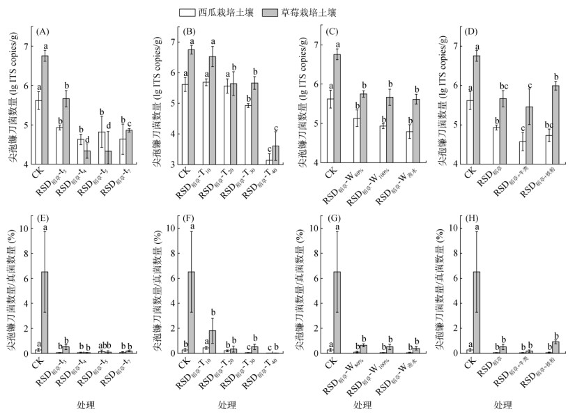 在不同温度条件下,与CK相比,RSD稻草-T10处理对两种土壤的尖孢镰刀菌数量无显著影响(P > 0.05),RSD稻草-T40处理的尖孢镰刀菌数量最低,其杀菌效果均达到99.7% 以上(图 3B)。两种土壤的尖孢镰刀菌数量在不同时间、水分状况以及物料类型条件下的RSD处理中均呈显著降低趋势(P < 0.05)。不同时间、水分状况和物料类型条件下的RSD处理在西瓜栽培土壤中的杀菌率分别达81.0% ~ 90.2%、67.8% ~ 85.6% 和81.0% ~ 90.9%,在草莓栽培土壤中的杀菌率分别达91.6% ~ 99.6%、90.4% ~ 92.8%和82.9% ~ 93.6%。除水分因素外,两种土壤的尖孢镰刀菌数量在其他因素下的RSD处理中呈显著差异(P < 0.05)(图 3A、3B和3D)。草莓栽培土壤的尖孢镰刀菌数量经RSD稻草-t4和RSD稻草-t5处理后显著低于RSD稻草-t3和RSD稻草-t7处理(P < 0.05)(图 3A);两种土壤的尖孢镰刀菌数量经RSD稻草+牛粪处理后低于RSD稻草和RSD稻草+铁粉处理。