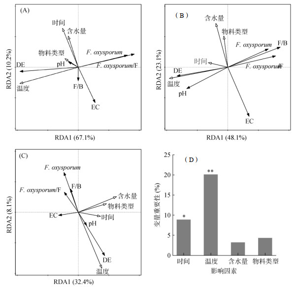 2.4 各因素对RSD处理效果影响的冗余分析和随机森林分析冗余分析结果表明,不同温度条件下的RSD处理(图 4A和4B)与两种土壤的尖孢镰刀菌数量、尖孢镰刀菌/真菌比及杀菌效果的相关性最大(P < 0.05),而其他因素下的RSD处理对其影响不显著(P > 0.05)。不同时间条件下的RSD处理与西瓜栽培土壤的电导率相关性最大(图 4A),不同温度和水分条件下的RSD处理与草莓栽培土壤的pH和电导率相关性最大(图 4B)。此外,对两种土壤综合分析均发现,RSD处理温度与土壤pH和杀菌效率呈正相关关系,与土壤的真菌/细菌比和尖孢镰刀菌数量呈负相关关系(图 4C);且通过随机森林分析发现,各因素对RSD处理杀菌效率的贡献程度排序为:温度、时间、物料类型和含水量(图 4D)。