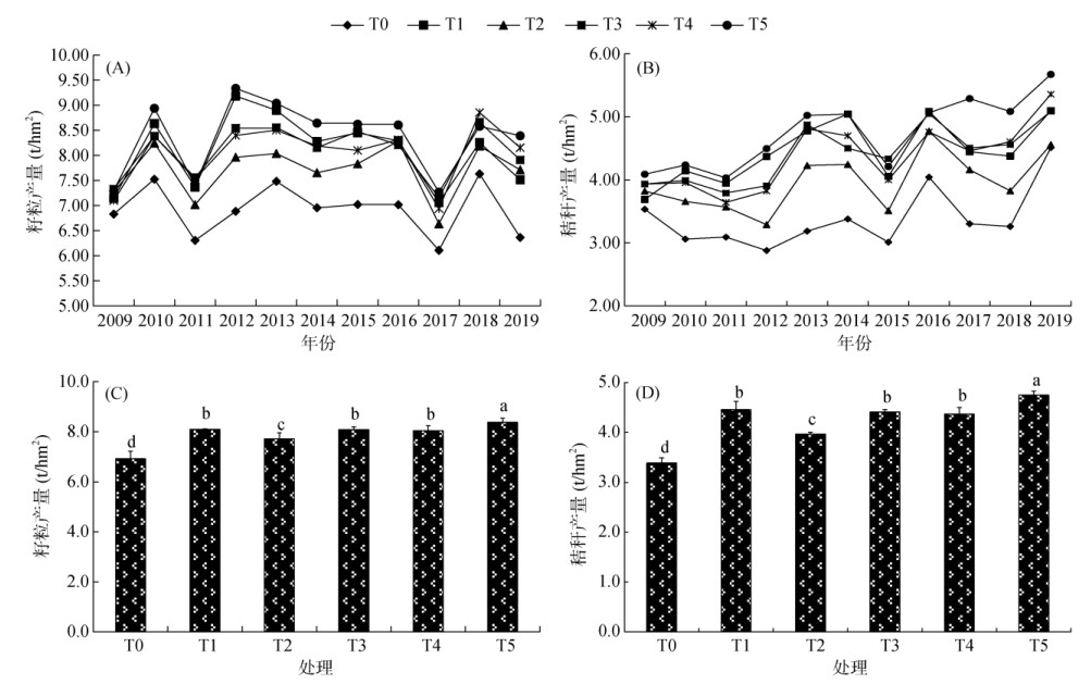 2 结果与分析 2.1 紫云英与有机物料连续还田对水稻产量的影响连续11 a紫云英与有机物料连续还田的水稻产量动态变化(图 1A、1B)可以看出,不同施肥均明显增加了水稻籽粒和秸秆产量,T5处理增产效果最为明显,不同年份籽粒产量较CK增幅6.8% ~ 35.6%;T2处理产量增幅最小,不同年份籽粒产量较CK增幅6.4% ~ 21.2%。从2009—2019年平均产量来看,相比CK,不同施肥处理的水稻籽粒增产11.4% ~ 21.0%,秸秆增产17.1% ~ 40.2%,差异均显著(图 1C、1D),其中紫云英与秸秆联合还田+40%化肥处理T5效果尤为明显,其连续11 a的籽粒与秸秆平均产量分别比T1处理提高3.4% 和6.6%,差异显著。从年际产量增产效果来看,前3年(2009—2011年)与后3年(2017—2019年)的T5籽粒产量分别比T1提高2.1% 与6.2%,显示随着试验进程的进行,T5与T1的产量差异变幅增幅在进一步扩大,说明秸秆与紫云英联合还田具有较高的化肥替代率与维持水稻增产潜力。另外,在未施用化肥条件下,仅翻压紫云英的T2处理籽粒产量与秸秆产量分别相当于T1的95.2% 与89.0%,差异均显著,而紫云英与秸秆或牛粪联合还田(T3和T4)的水稻产量与T1处理未有明显的差异,表明对中低产黄泥田而言,紫云英+秸秆或紫云英+牛粪模式与水稻习惯施肥产量基本相当。