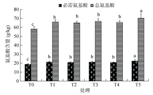 籽粒氨基酸是表征稻米营养品质的重要成分。从第10年各处理籽粒氨基酸含量来看,与CK相比,施肥均显著提高了水稻籽粒中必需氨基酸与氨基酸总量(图 2),其中,籽粒氨基酸总量增幅为11.5% ~ 20.6%,必需氨基酸增幅11.1% ~ 19.8%,均以T5处理最高。与单施化肥T1处理相比,T5处理的必需氨基酸与氨基酸总量分别增加5.7%和6.5%,差异均显著,而处理T1、T2、T3、T4处理间未有明显差异。上述说明,紫云英与水稻秸秆联合还田,不仅可实现化肥减量60%,而且可提高籽粒氨基酸品质。