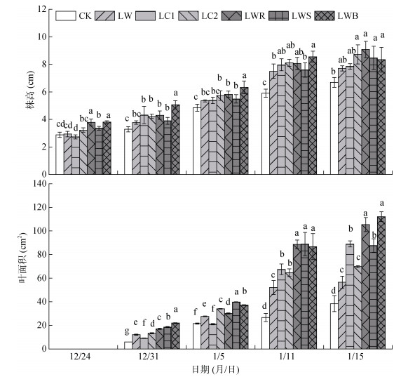 2 结果与分析 2.1 不同外源有机物和黏粒材料添加对菠菜生长和生理指标的影响在菠菜整个生育期内,与CK相比,添加外源有机物和黏粒材料对菠菜株高和叶面积的增加具有不同程度的促进效果(图 1)。由图 1可知,随着生长时间的增加,不同处理下菠菜株高显著增加,在生长旺期(2020年1月11日),LWB处理显著大于其他处理,株高为8.6 cm,CK最小为5.9 cm,其他处理间无显著性差异,株高变幅在7.5 ~ 8.1 cm。在收获期(2020年1月15日),与CK相比,单施外源有机物处理菠菜株高有不同程度的增加,其中LC2处理增幅最大,增加了30.2%,LW处理增幅最小为15.2%;与LW处理相比,LWR、LWS和LWB处理株高有一定程度的增加,增幅在0.6% ~ 15.8%,所有处理中LWR处理株高最大,为9.1 cm,CK最小为6.7 cm。由图 1还可知,在幼苗期内(2019年12月24日至2020年1月5日),各处理菠菜叶面积均呈显著性差异,单施外源有机物处理中,LW和LC2处理大于LC1处理;与LW处理相比,LWR、LWS和LWB处理有一定程度的增加,CK显著小于其他处理。在收获期,LW、LC2、LC1、LWS、LWR和LWB处理下菠菜叶面积分别是CK的1.5倍、1.8倍、2.3倍、2.3倍、2.8倍和2.9倍,其中LWB处理最大,为1 12.1 cm2/株,CK最小为38.3 cm2/株。
