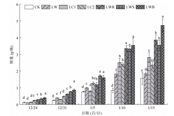 在菠菜收获期(2020年1月15日),不同处理之产量差异性显著,其中LWB处理最大,为4.7 g/株,是CK的2.9倍。不同处理间产量由大到小依次表现为:LWB > LWR > LWS > LC1 > LC2 > LW > CK。