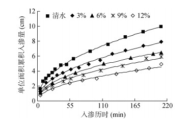 研究表明,不同浑水含沙率的累积入渗量与入渗历时的关系曲线均符合Kostiakov入渗模型。