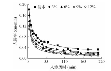2 结果与讨论 2.1 含沙率对入渗特性的影响 2.1.1 含沙率对入渗能力的影响反映土壤入渗能力的指标为累积入渗量和入渗率。由图 2、图 3可以看出,不同浑水含沙率的累积入渗量随着入渗历时的延长不断增大,而入渗率则不断变小,最终趋于稳定。入渗历时相同时,累积入渗量和土壤入渗率随浑水含沙率的增加而减小。当浑水含沙率由3% 增大至12% 时,入渗结束时其累积入渗量由7.90 cm减少至4.90 cm,降幅为37.97%;相对应的稳定入渗率由0.021 6 cm/min降低至0.010 3 cm/min,降幅为52.31%,表明含沙率对浑水一维垂直入渗能力影响显著。这与文献[22-23]的研究结论类似,其中王全九等[23]将浑水泥沙对一维垂直入渗能力的减渗原因归咎于浑水泥沙对湿润锋处吸力的减小,并且研究表明湿润锋处平均吸力与浑水含沙率呈负相关关系。土壤浑水入渗特性与土壤自身特性和浑水含沙率密切相关[20, 24],浑水入渗时,泥沙颗粒逐渐在土壤表面挂淤落於,沉积在土壤表层(落淤层),并伴随着入渗水将细颗粒带入土壤孔隙中,浑水泥沙滞留减少了表层土壤的孔隙率(滞留层),形成一个密度较大的致密层[23]。这个致密层阻渗作用强,而浑水中含沙率越大,该致密层形成越快、越密实,对土壤的入渗能力影响越大。