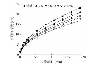 由图 4可以看出,入渗历时相同时,湿润锋运移距离随浑水含沙率的增加而减小,如浑水含沙率由3%增大至12% 时,入渗结束时其湿润锋运移距离由21.15 cm减少至17.75 cm,降幅为16.08%,表明浑水含沙率对湿润锋运移距离影响显著,这与白瑞等[11]的研究结果相似。这主要是由于浑水入渗时,浑水中泥沙逐渐在土壤表面挂淤落於,形成一个密度较大的致密层,而浑水含沙率越大,该致密层形成越快越密实,对水分的阻渗作用越强,因此导致其湿润锋运移距离越小。
