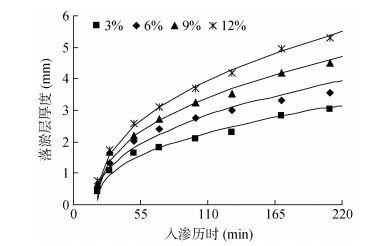 2.2 含沙率对致密层形成特性的影响 2.2.1 含沙率对落淤层厚度的影响由图 5可以看出,不同含沙率对应的落淤层厚度均随入渗历时的增大而不断增大;相同入渗历时,落淤层厚度随浑水含沙率的增加而增大,入渗结束时,含沙率为3%、6%、9%、12% 的落淤层厚度分别为3.02、3.56、4.51、5.29 mm。入渗初期(0 ~ 20 min),落淤层厚度较小,这主要是由于浑水中泥沙颗粒伴随着入渗水将进入到土壤孔隙中,主要以滞留层形式进入到土壤表面,所以落淤层厚度小得无法测量。入渗中期(20 ~ 130 min)的落淤层厚度增加较快,随着入渗历时的增大,厚度增加速率逐渐变小,这是由于随着浑水累积入渗量的增加,土壤孔隙逐渐被泥沙颗粒填充,浑水中泥沙小颗粒继续洗入到土壤孔隙中,以滞留形式进入到土壤,而浑水中较大泥沙颗粒则沉积在土体表面形成落淤层,入渗过程中落淤层逐渐加厚,阻塞入渗通道,并延长了水分进入土体的路径,使得土壤导水能力变弱,进一步阻碍浑水入渗,由于浑水入渗量减小,供水速度减慢,导致落淤层厚度增加速率逐渐变小。入渗后期(130 ~ 210 min)的落淤层厚度随着入渗时间稳定增加,此时土壤表面致密层已经形成,泥沙颗粒主要以落淤层形式沉积于土壤表面,浑水入渗能力随入渗时间减小的幅度较小,所以落淤层厚度增幅也逐渐趋于基本稳定。