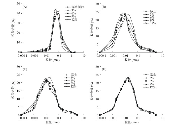 2.2.2 含沙率对致密层颗粒组成的影响由图 6A的落淤层土壤颗粒组成含量曲线可知,在灌水结束时,不同浑水含沙率的落淤层中土壤细颗粒含量均低于浑水泥沙,大颗粒含量均高于浑水泥沙,表明浑水入渗过程中存在滞留现象,细颗粒进入了原土壤中,即损失了部分细颗粒的泥沙沉积在表层土壤形成落淤层。以浑水泥沙的颗粒组成为对照,含沙率为3%、6%、9%、12% 的落淤层对应的黏粒相对含量减幅依次为3.82%、25.95%、29.01% 和48.09%,表明随着浑水含沙率的增大,滞留现象越明显,落淤层细颗粒损失越多使得其相对含量越少;沙粒相对含量增幅依次为17.04%、37.53%、42.89% 和52.56%,表明随着浑水含沙率的增大,滞留现象越明显,落淤层粗颗粒相对含量越多。落淤层土壤颗粒分析结果见表 6,可以看出,不同浑水含沙率的落淤层土壤物理性黏粒含量显著低于浑水泥沙,以浑水泥沙的颗粒组成为对照,浑水含沙率3%、6%、9%、12% 的落淤层对应的物理性黏粒含量d0.01减幅依次为16.72%、42.55%、46.30% 和61.50%,表明浑水中泥沙含量越大,细颗粒伴随着入渗水洗入到土体的越多,其沉积在土壤表面形成落淤层的相对含量越少。