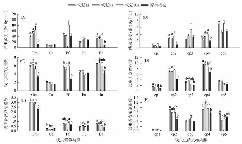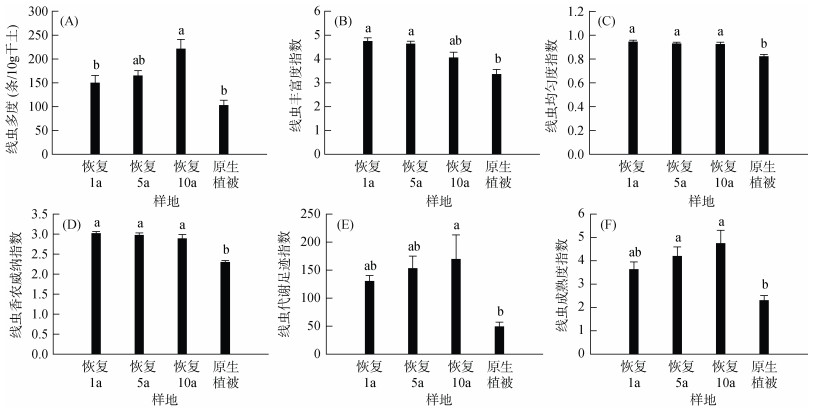 图 2 不同恢复期样地的线虫群落生态参数 Fig. 2 Ecological parameters of nematode communities in plots with different restoration periods |