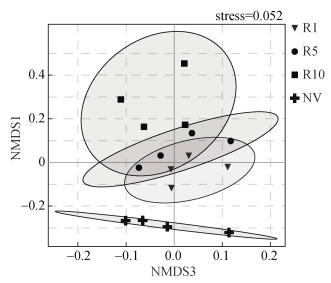 (R1:恢复1 a样地;R5:恢复5 a样地;R10:恢复10 a样地;NV:原生植被样地) 图 4 四种样地线虫群落组成的NMDS图 Fig. 4 Non-metric multidimensional scaling ordination of nematode community compositions of different plots |