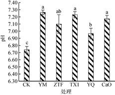 2 结果与分析 2.1 不同调理剂对土壤pH和提取态镉的影响在推荐用量下,施加调理剂的各处理土壤pH均为中性,且较CK处理均显著升高(图 1)。其中,调理剂YM和TX1处理下,土壤pH升高幅度最大,较CK处理分别提高了0.52和0.49个单位,与等量生石灰(CaO)处理效果相似。YQ调理剂对土壤pH调控效果略差,但土壤pH也提高了0.23个单位,显著高于CK处理。施用调理剂处理与CK处理土壤pH均高于供试原始土壤(5.57),这可能是由于淹水条件下土壤pH趋于中性的原因。