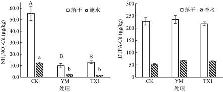 (图中无标记字母,表示各处理间差异不显著(P > 0.05)) 图 3 淹水与落干条件下不同调理剂3倍推荐用量对NH4NO3-Cd和DTPA-Cd含量的影响 Fig. 3 Effects of triple-recommended dosage of passivators on NH4NO3-Cd and DTPA-Cd concentrations in soil under flooded and aerobic conditions |