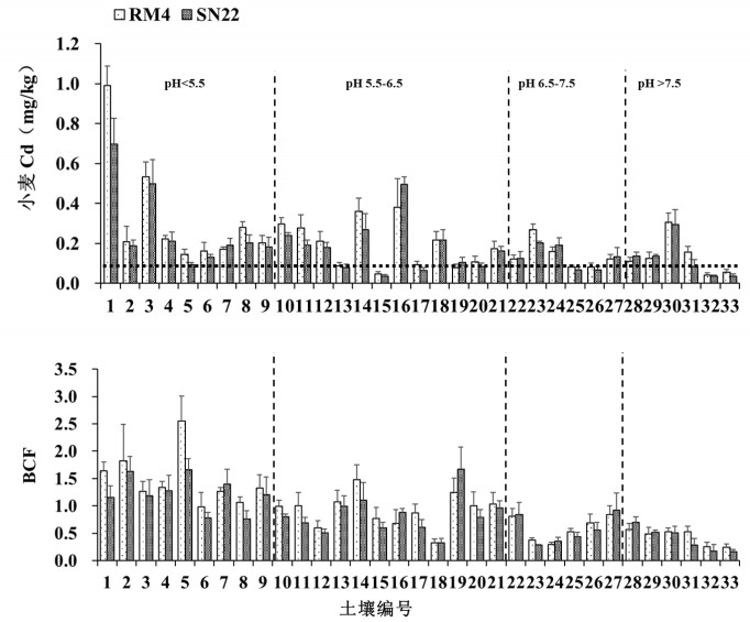 此外,两个品种小麦的Cd生物富集系数(BCF)分别是0.92(0.24 ~ 2.55)和0.81(0.16 ~ 1.67)。RM4和SN22小麦籽粒对Cd的BCF最大值分别为是2.55和1.67,其对应的土壤分别采自广东江门(pH 5.50)和云南德宏(pH 6.22)的酸性土壤;BCF最小值分别是0.24和0.16,其对应的土壤均为采自江苏连云港的碱性土壤(pH 8.94)。通过分析两个品种小麦籽粒Cd的BCF可发现,RM4和SN22的BCF > 1的样品数分别是14个和9个,说明小麦是一种对Cd富集能力较强的作物。主要原因是小麦籽粒Cd的积累主要是通过根部富集后运输到旗叶韧皮部再进入籽粒,即小麦植株内较强的Cd转运能力导致其籽粒Cd大量积累[17]。进一步分析还发现,在强酸性(pH < 5.5)土壤中小麦籽粒Cd含量和BCF值均较大,且BCF值也随土壤pH升高均呈下降趋势,说明土壤pH也是影响小麦籽粒Cd的BCF的重要土壤性质。
