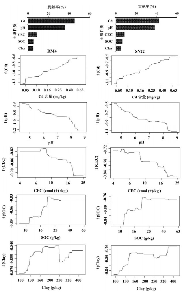 本研究利用GBM分析土壤全Cd、pH、SOC、CEC和黏粒含量对两个品种小麦籽粒Cd积累的相对重要性和贡献率。首先,对上述土壤变量(除pH外)进行对数转换,以保证方差的齐性。如图 3所示,土壤全量Cd和pH对两个品种小麦籽粒Cd含量相对贡献率较高,而土壤CEC、黏粒含量和SOC含量的相对影响较弱。土壤性质对RM4籽粒Cd含量的贡献率排序为:全Cd(45.2%) > pH(36.1%) > CEC(8.40%) > SOC(5.30%) > 黏粒(5.00%);对SN22籽粒Cd含量的贡献率排序为:全Cd(42.5%) > pH(38.0%) > CEC (8.30%) > SOC(6.20%) > 黏粒(5.00%)。单一变量的偏相关图(图 3)表明,全量Cd和pH对两个品种小麦籽粒Cd含量的影响表现出相同的趋势,土壤全量Cd在供试测定范围内促进小麦籽粒Cd吸收,土壤pH从4.5上升至8.5将降低小麦籽粒Cd吸收。土壤CEC由9.0 cmol/kg上升至20.0 cmol/kg,RM4品种小麦籽粒Cd吸收明显下降;但对SN22,CEC影响范围是4.0 ~ 20.5 cmol/kg。在11.0 ~ 20.5 g/kg范围内,两个品种小麦籽粒Cd吸收随SOC含量的增大而升高。黏粒含量在110 ~ 140 g/kg和320 ~ 360 g/kg范围内两个品种小麦籽粒Cd吸收随黏粒含量上升而升高(图 3)。