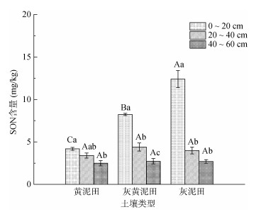 (大写字母不同表示同一土层不同土壤间差异显著(P<0.05),小写字母不同表示同一土壤不同土层间差异显著(P<0.05),下图同) 图 1 不同类型水稻土不同土层SON含量 Fig. 1 Contents of SON in different soil layers of different paddy soils |