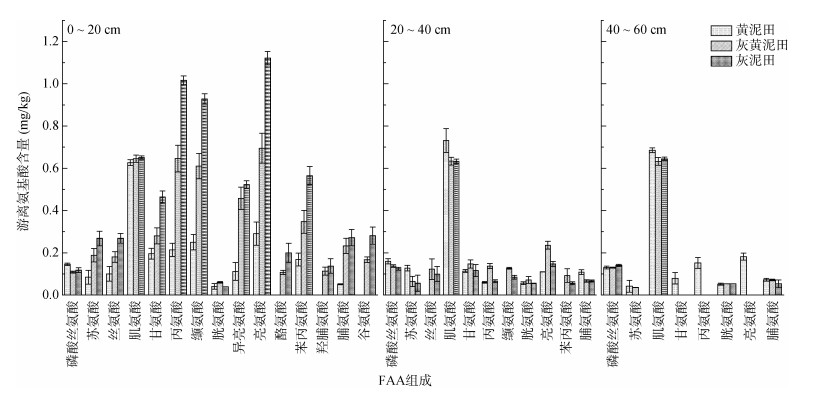 图 3 不同类型水稻土不同土层FAA组成 Fig. 3 Compositions of FAA in different soil layers of different paddy soils |
