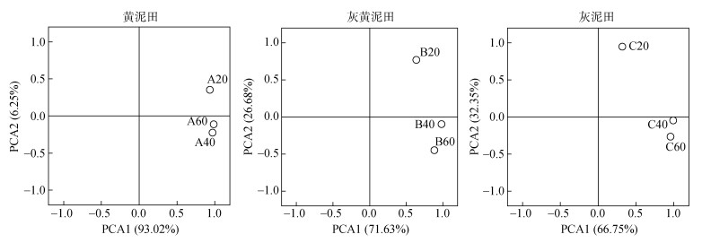 (图中A、B和C分别表示黄泥田、灰黄泥田和灰泥田;20、40和60分别表示0 ~ 20、20 ~ 40和40 ~ 60 cm土层) 图 4 不同类型土壤不同土层FAA组成的主成分分析 Fig. 4 Principal component analysis of FAA composition in different soil layers of different paddy soils |