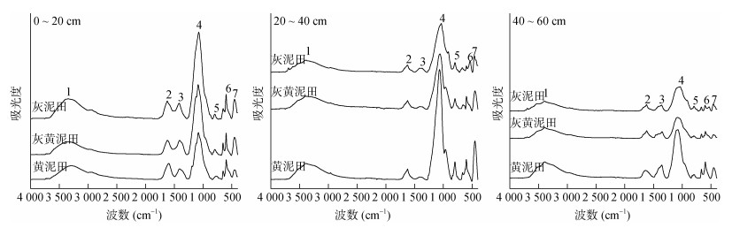 不同类型水稻土不同土层可溶性组分浸提液的红外光谱均存在7个明显的吸收峰(图7)。就不同类型水稻土而言,0 ~ 20 cm土层各吸收峰的峰面积均表现为灰泥田>灰黄泥田>黄泥田的变化趋势;20 ~ 40 cm土层峰1和峰4的峰面积表现为黄泥田高于灰黄泥田和灰泥田;而40 ~ 60 cm土层各吸收峰的峰面积均表现为黄泥田高于灰黄泥田和灰泥田,表明黄泥田底层土壤中SON累积量大于灰黄泥田和灰泥田。就不同土层而言,黄泥田峰1和峰4的峰面积均表现为20 ~ 40 cm>40 ~ 60 cm>0 ~ 20 cm,而灰黄泥田和灰泥田则均表现为0 ~ 20 cm>20 ~ 40 cm>40 ~ 60 cm;不同类型水稻土峰2的峰面积均表现为0 ~ 20 cm>20 ~ 40 cm>40 ~ 60 cm,而其他吸收峰的峰面积无明显的变化规律。可见,大分子可溶性氮主要分布在水稻表层土壤中,而小分子可溶性氮具有在水稻土底层累积的趋势,且黄泥田的累积量最大。