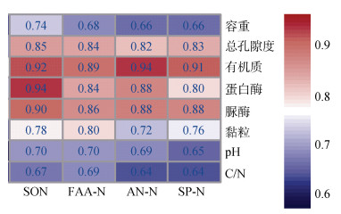 为探究不同影响因子对土壤SON及其组分的影响大小,采用灰色关联分析模型计算了水稻土SON及其组分与可能影响因子之间的关联程度(图8)。就水稻土SON含量影响因素而言,土壤有机质、蛋白酶和脲酶与SON的关联系数较大,均高于0.90,其次为总孔隙度,关联系数为0.85。从水稻土SON主要组分的影响因素来看,土壤有机质与FAA-N、AN-N和SP-N的关联度均为最高,关联系数分别为0.89、0.94和0.91,其次为总孔隙度、脲酶和蛋白酶,关联系数介于0.80 ~ 0.88。可见,有机质、总孔隙度、蛋白酶和脲酶活性与水稻土SON含量及组分差异密切相关。