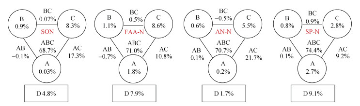 (A代表有机质,B代表总孔隙度,C代表脲酶活性和蛋白酶活性,D代表未解释量;AB、BC和AC分别代表有机质和总孔隙度、总孔隙度和酶活性、有机质和酶活性的协同作用;ABC代表有机质、总孔隙度和酶活性的协同作用) 图 9 水稻土SON各组分主要影响因素的方差分解分析图 Fig. 9 Variance partitioning analysis diagram of main influencing factors of SON in paddy soil |