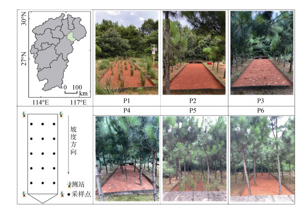 1 材料与方法 1.1 研究区概况试验位于南方红壤丘陵区鹰潭红壤生态实验站(28°15′N,116°55′E)。该站处于中亚热带季风气候区,干湿季节明显,多年平均降水量为1 785 mm,集中在7—9月[20-21];平均气温17.8 ℃,热量充沛。现有植被主要为马尾松(Pinus massoniana Lamb.)、象草(Pennisetum purpureum Schum.)和白茅(Imperata cylindrica (L.) Beauv)[22]。试验土壤为第四纪红色黏土发育的红壤[21],土壤砂粒、粉粒、黏粒含量分别为24.56%、37.48%、37.96%,土壤有机质含量为18.07 g/kg,土壤容重为1.23 g/cm3[22]。