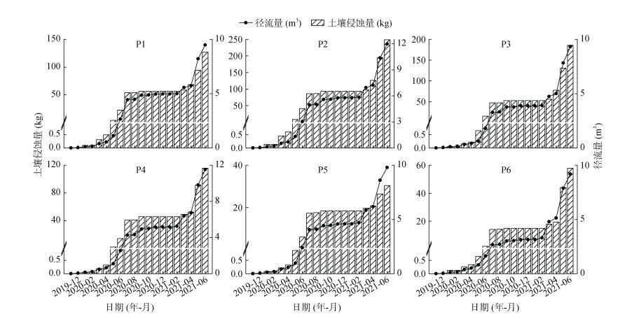 2 结果与分析 2.1 实测小区径流与土壤侵蚀量试验区侵蚀性降水雨量标准为12 mm[26],研究时段内共观测到93次侵蚀性降水事件,降水量合计2 446.5 mm,集中于6—7月(图 2)。不同地表覆盖条件下各小区逐月累积径流量及土壤侵蚀量存在差异(图 3)。P2、P4小区累积径流量多达12 m3,其余小区累积径流量较少,但也超出9 m3。不同地表覆盖条件对小区径流产生明显影响。