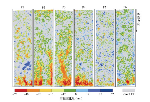 3.3 地表覆盖条件对TLS监测minLOD影响TLS监测点云高程变化噪声主要来自点云质量、配准误差和地表粗糙度[16]。配准误差及地表粗糙度越大,minLOD也越大。本研究平均minLOD(8 mm)较Li等[12](1 mm)的大,原因在于后者的配准误差为室内单一理想条件下同一固定表面两期点云高差的标准差;而本研究中TLS野外监测的配准误差为Cyclone软件中3个黑白标靶点配准误差的最大值[16],且P1 ~ P6多数小区地表分布植被和石块,使得配准误差和地表粗糙度均较大。但本研究6个小区的minLOD范围(4 ~ 60 mm)与Eltner等[34](20 mm)和Lague等[16](6 ~ 60 mm)在野外农田及河岸侵蚀研究的计算范围相近,表明相较于室内理想模拟条件,野外地表条件下的minLOD均较大。