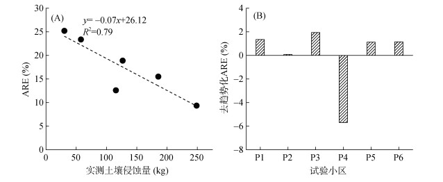图 6 实测土壤侵蚀量与TLS监测ARE线性趋势(A)和去趋势后ARE(B) Fig. 6 Measured soil erosion amount and TLS-monitored ARE linear trend (A) and ARE after detrending (B) |