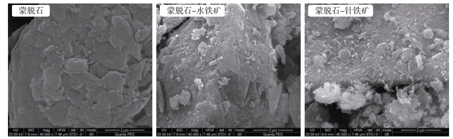 2 结果与讨论 2.1 蒙脱石-氧化铁二元复合体形貌特征图 1为蒙脱石、蒙脱石-水铁矿和蒙脱石-针铁矿复合体的SEM图谱。蒙脱石为层状或片状结构,颗粒团聚在一起,但结合相对松散。与纯蒙脱石相比,蒙脱石-水铁矿复合体表面存在大量细小的无定形水铁矿颗粒;蒙脱石-针铁矿复合体表面含有针状或短棒状的针铁矿结构。蒙脱石-水铁矿/针铁矿的结合比较紧密,主要因为蒙脱石表面携带负电荷,而铁氧化物带正电,两者之间有较强的静电引力。氧化铁覆盖在蒙脱石表面可能形成一层“氧化铁”膜,进一步可能改变污染物的界面吸附行为。
