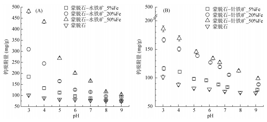 蒙脱石、蒙脱石-水铁矿/针铁矿复合体对钨的pH吸附结果见图 2。在较宽的pH范围(3 ~ 9)中,蒙脱石对钨的吸附量介于70 ~ 100 mg/g。蒙脱石晶体结构中的Si4+和Al3+均能和低价金属离子置换,这种同等置换现象导致蒙脱石晶体负电荷过剩[19]。而钨在溶液中以WO42–形式存在,二者能产生较大的静电斥力,所以单一蒙脱石对钨的吸附量并不高。随pH升高钨吸附量降低,这与前人结果[10]类似,归因于随pH升高,吸附体系负电性增加,WO42–与蒙脱石的排斥力增加,从而降低了钨的吸附。
