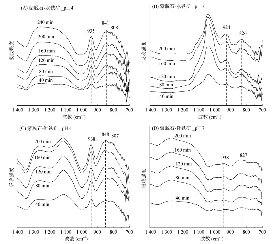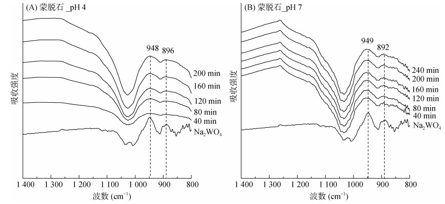 2.3 钨的表面络合形态利用原位ATR-FTIR技术研究了吸附态钨的络合形态。图 3A和3B分别为蒙脱石在pH 4和7时,表面吸附态钨的红外光谱。随反应时间的增加,钨的红外光谱峰强增加,在120 min时基本达到吸附平衡。Na2WO4在吸收峰位948 cm–1和896 cm–1处有两个明显的峰,可能归属于W-O的对称伸缩振动[24]。在pH 4和pH 7时,钨在蒙脱石上的吸附光谱都与Na2WO4光谱有较高的一致性,暗示蒙脱石表面吸附态钨结构与WO42–结构相同,意味着钨没有发生内圈络合反应,而主要以外圈络合物形式结合在蒙脱石表面。
