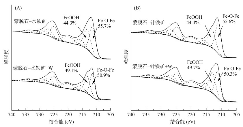 图 5 蒙脱石-水铁矿和蒙脱石-针铁矿复合体吸附钨前后Fe 2p XPS光谱 Fig. 5 Fe 2p XPS spectra of Mont-Fh and Mont-Goe complexes before and after binding of tungsten |