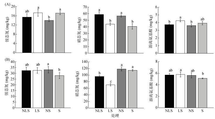 2 结果与分析 2.1 凋落物和氮添加对两种林型土壤可溶性氮的影响由图2A可知,与S比较,NS处理针叶林土壤铵态氮含量显著降低了18.4%,硝态氮含量显著上升39.2%,游离氨基酸含量仅降低8.1%;与LS处理相比,NLS处理铵态氮含量降低了10.8%,而硝态氮含量显著升高33.3%,游离氨基酸含量显著降低12.0%。方差分析(表2)显示,对于针叶林土壤,仅氮添加对铵态氮和硝态氮有显著影响(P<0.01)。